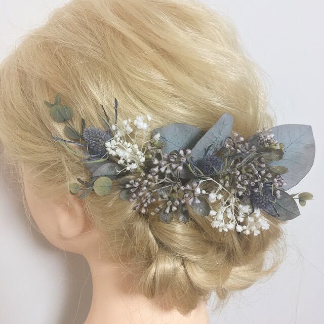 ドライフラワー プリザーブドフラワー アーティフィシャルフラワー ガーデンウェディング ブライダル ウェディング 結婚式 ヘアパーツ 花 ナチュラル 葉っぱ あじさい かすみ草 グリーン 水色 くすみ スモーキー 大人可愛い グレー サムシングフォー おしゃれ ヘッドピース 髪飾り ヘッドドレス ラスティック